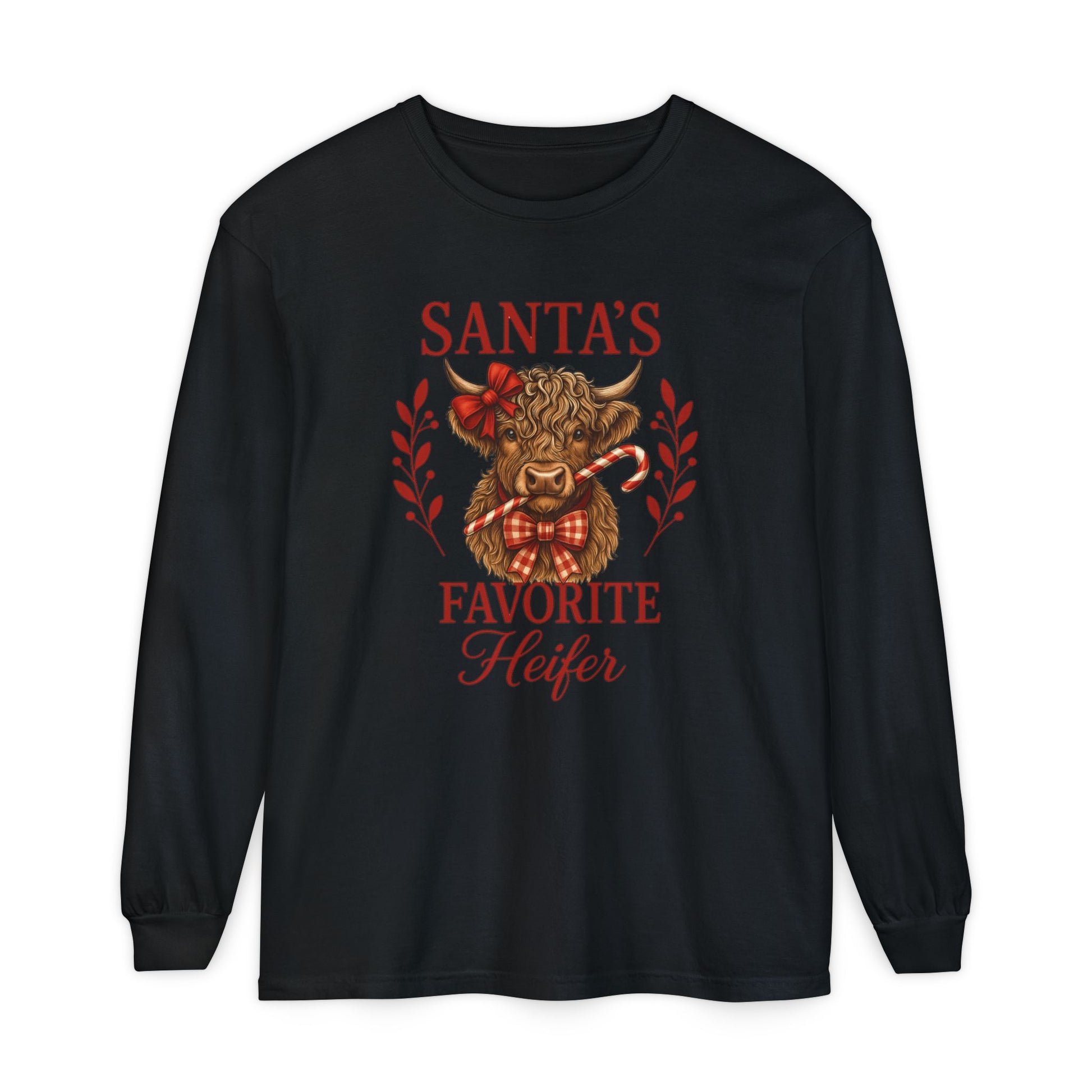 This long-sleeve shirt brings a cozy, down-to-earth twist to holiday style. Soft garment-dyed cotton drapes with a lived-in feel while a whimsical heifer illustration and warm red lettering read “Santa’s Favorite Heifer,” adding farmhouse charm with a wink. The classic fit and medium-weight fabric make it easy to layer under jackets or wear alone for relaxed, chilly days on the porch, at holiday markets, or while wrapping gifts. Elastic ribbed cuffs keep sleeves in place during chores or cocoa sips. Durable double-stitched hems and reinforced neck and shoulder tape mean this’ll stay part of your seasonal rotation year after year.