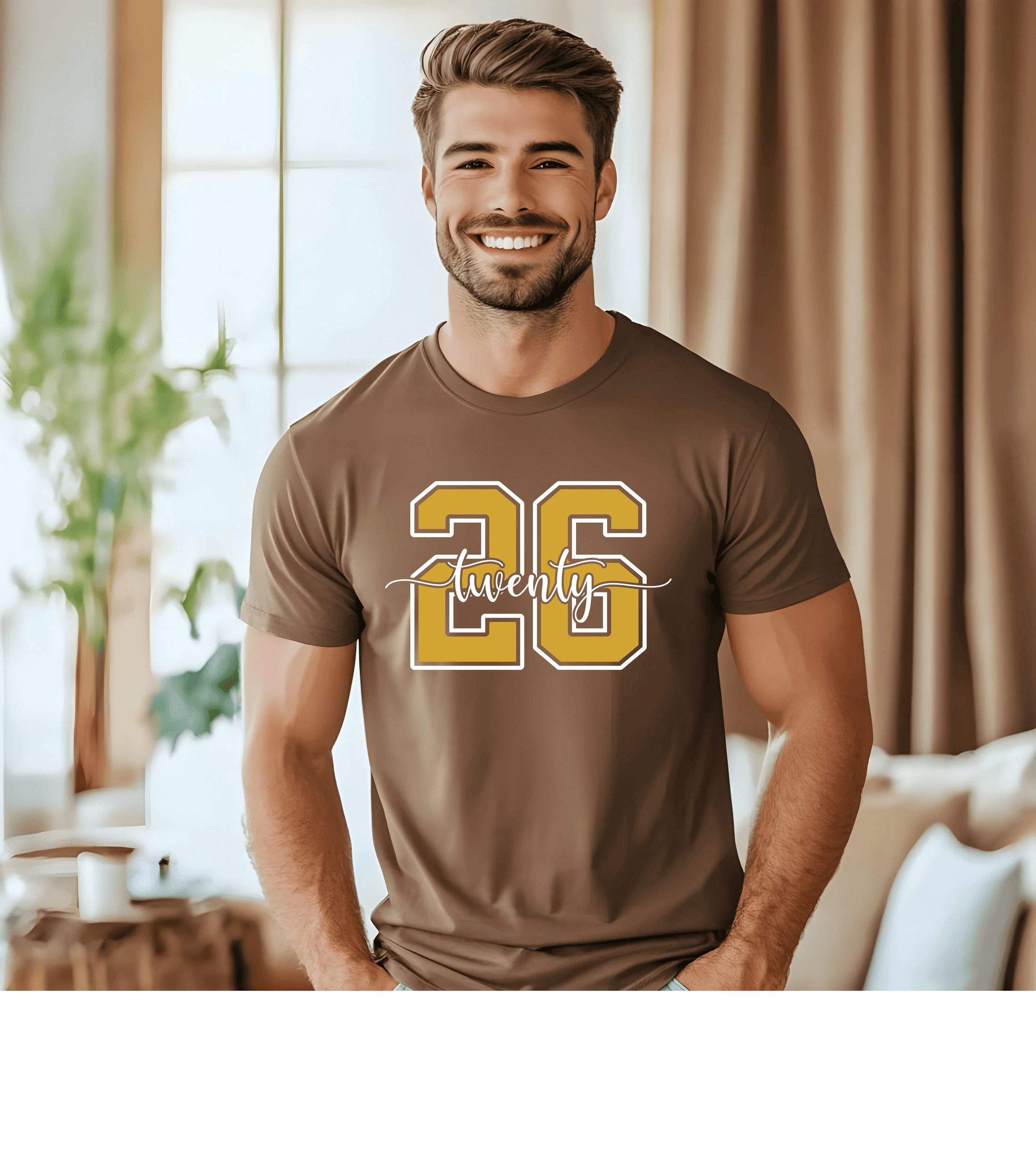 This tee carries a quiet, confident energy—the bold block number “26” in warm gold with a handwritten “twenty” sweeping across the front. It reads like a varsity number reimagined for someone who wants athletic roots with a modern, personal touch. The fabric is lightweight and smooth, draping easily and staying breathable through seasons. Wear it layered under a denim jacket for cool evenings, with joggers for a low-effort weekend, or simply on its own to let the graphic speak. It feels lived-in from the first wear and soft against the skin, while the clean crew neckline and classic cut keep the look versatile and approachable.